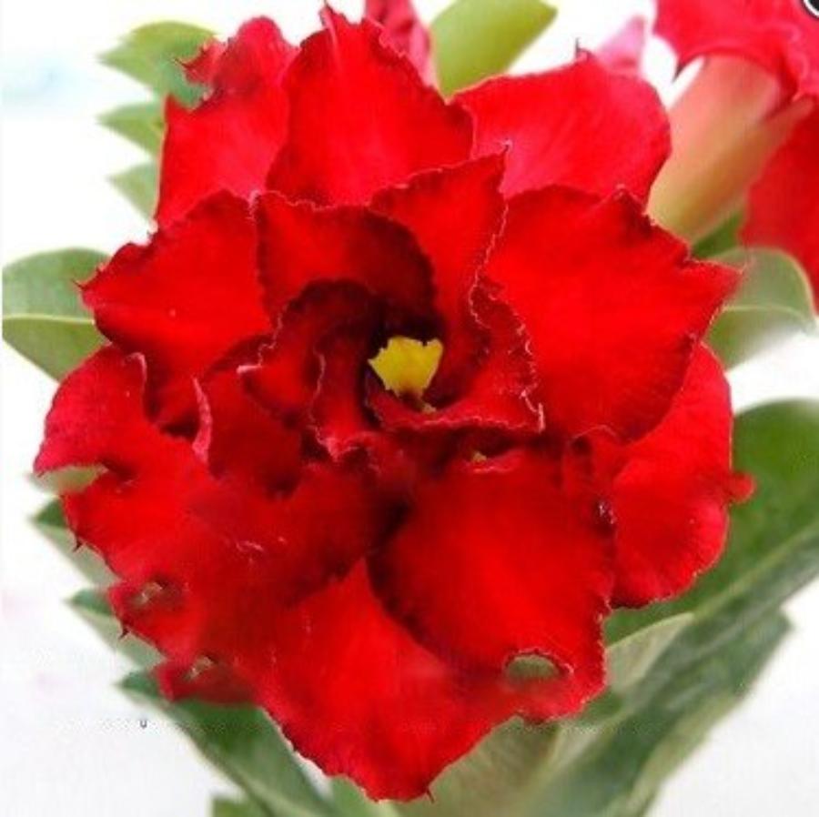 Adenium Flame Angel - куст компактный, раскидистый. Листья оригинальные, крупные, зеленые. Сорт отличается большими, роскошными, махровыми (в 2, 3 и даже 4 ряда лепестков, подобно пышной розе), насыщенно-алыми цветками с тонкой темной каемкой по краям лепестков. Цветение обильное и длительное - с ранней весны до глубокой осени.