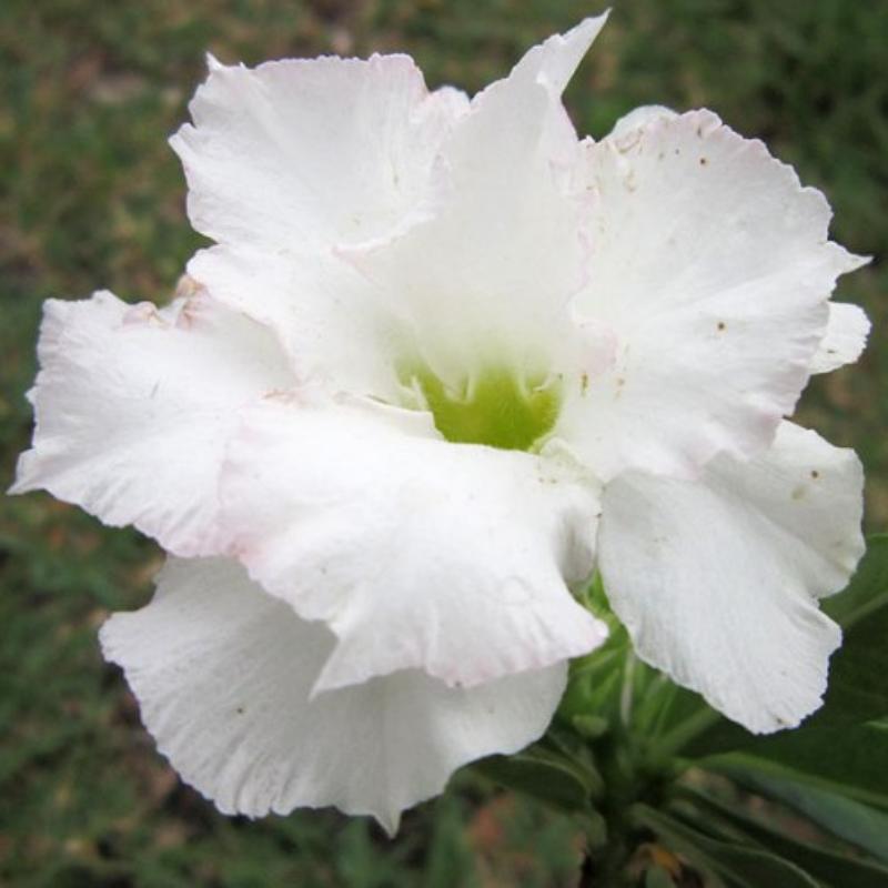 Adenium White Angel - экзотическое маленькое деревце или компактный кустарник. Листья у него темно-зеленые, длинные. Цветки средне-махровые. Лепестки округлые, большие, с гофрированными краями. Окрас лепестков снежно-белый со светло-зеленым горлом.