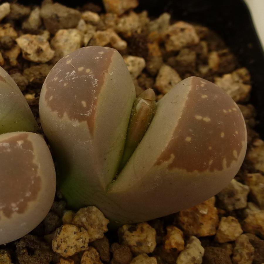 Литопс Olivaceae - экзотическое цветущее растение. Диаметр пары листьев около 2 см. Окраска листьев - от оливково-зеленой до коричневой. Отдельные штрихи и крапинки в окраске верхней поверхности сливаются в единое, более темное пятно в центре. Цветки желтые.