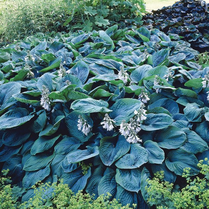 Хоста Brеssinghаm Bluе – это многолетнее гибридное растение, имеющее красивые листья голубого цвета и особенной формы. Очень большие (до 35 см в длину), складчатые, голубовато-серые или сине-зеленые чашевидно-сердечные листья делают этот сорт уникальным и запоминающимся. Они слегка волнистые, ребристые, с хорошо выраженными жилками. Куст имеет высоту до 60–70 см и разрастается до 1 м в диаметре. В середине лета многолетник начинается цвести, и его белые, крупные колокольчатые цветы особенно эффектно выглядят на зелено-голубом фоне. Сорт хорошо разрастается, неприхотлив, морозостоек, предпочитает слегка кислые почвы и влажные места с ажурной тенью. Любит одиночные посадки, но будет роскошно выглядеть и в смешанных группах в тенистых цветниках или у водоемов.