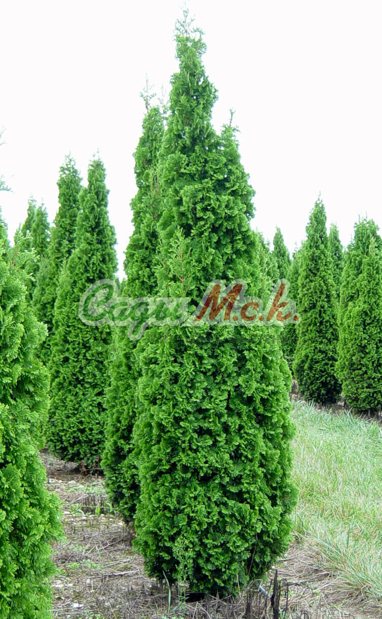 Туя складчатая Аtrovirens - дерево 12-15 м высоты, диаметром 3-5 м. Крона коническая, плотная, компактная. Хвоя насыщено темно-зеленая, блестящая. Растет быстро, часто используется для живых изгородей.